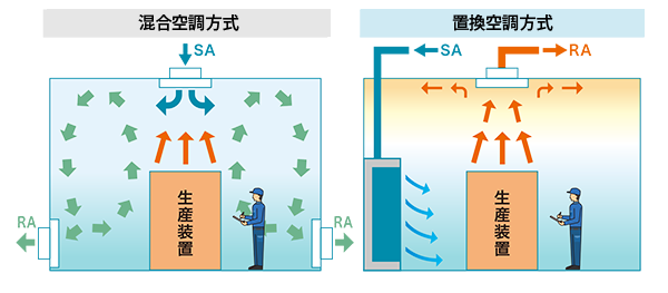 室内の空調方式には、空気をかき混ぜて室内全体の状態を均一にする混合空調方式と、空気の流れを利用して天井から汚れた空気を排出する置換空調方式があります。