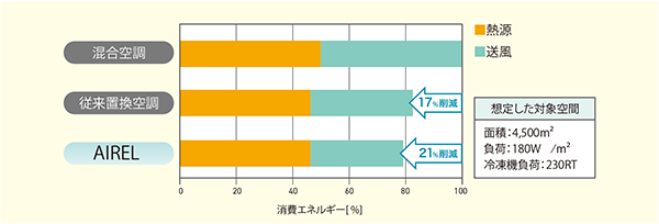 これにより、従来の置換空調方式よりも空調機からの給気風量をさらに抑えることができ、送風(搬送)動力の低減により、省エネルギーに貢献します。シミュレーションの結果、AIRELは混合空調方式と比べてエネルギー消費量を約20%削減、従来の置換空調方式と比べてもさらに約5%の削減が見込まれます。